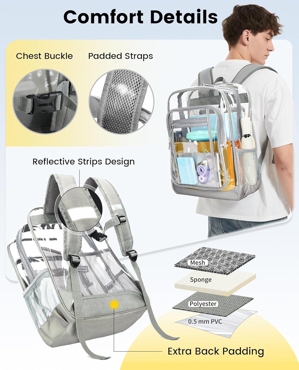 Comfortable padded straps: The kids clear backpack for girls and boys features wide, padded shoulder straps and a chest buckle that can relieve shoulder stress and make it easier to carry heavy stuff. The bottom of the clear backpacks for school is designed with 600D polyester and added padding, which improves its load-bearing capacity