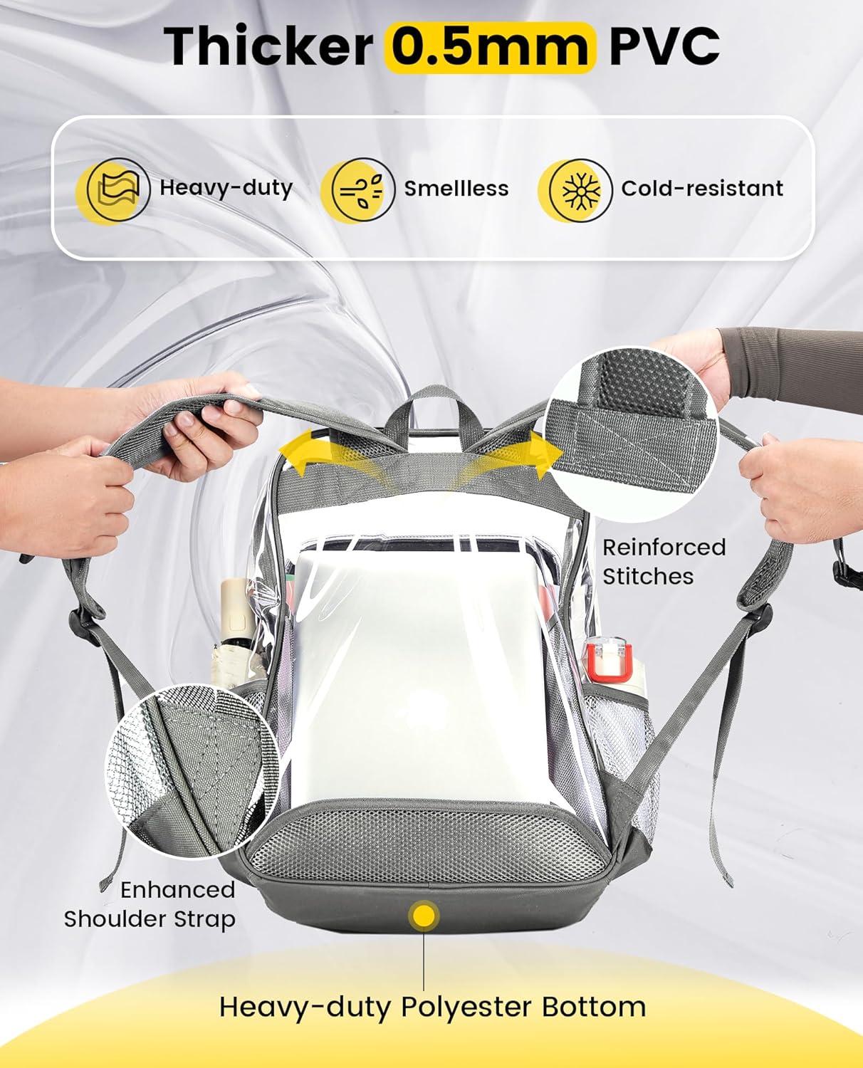 Heavy-duty clear backpack: The Vorspack large clear backpack measures 17″ x 13″ x 6.5″. It is made of thickened PVC material and has a strong structural design, making it sturdy and durable. The see-through backpack is perfect for college and work, as it allows for quick checks and ensures your belongings are always visible