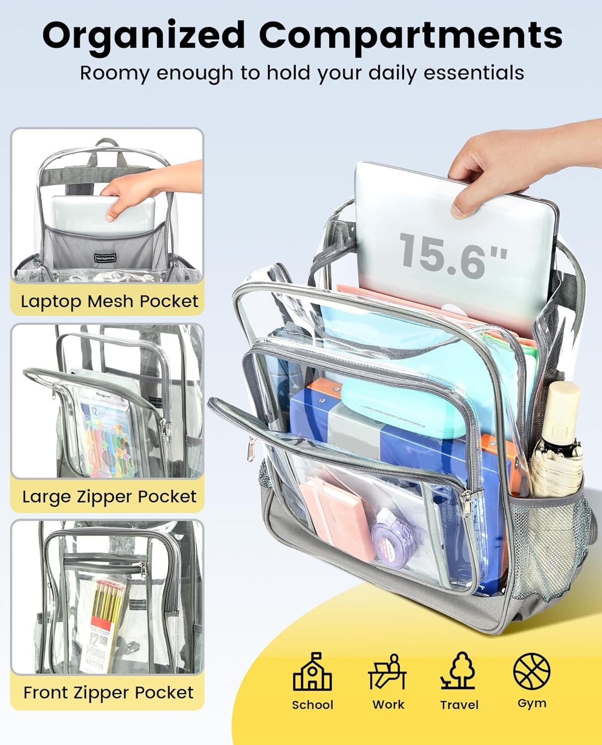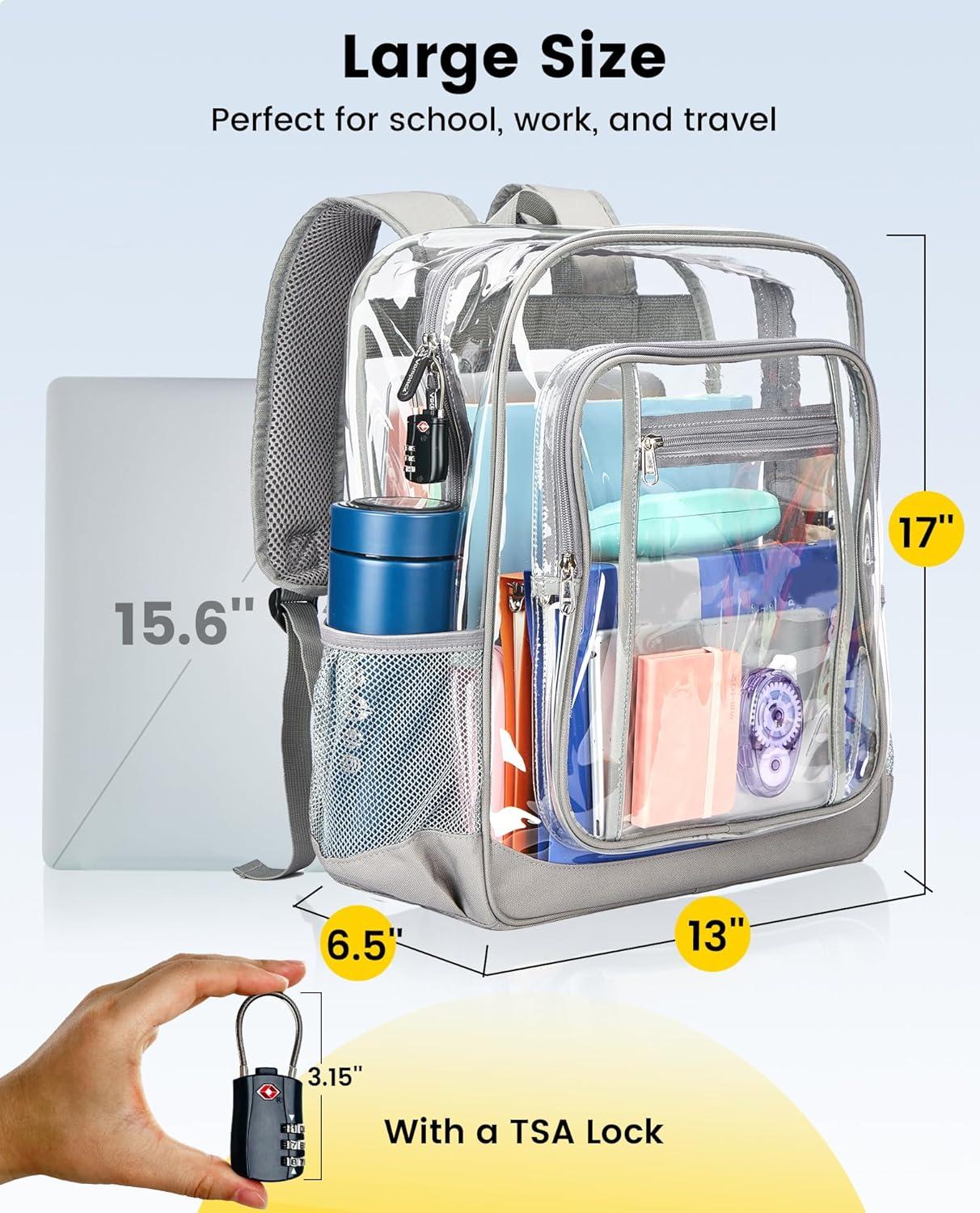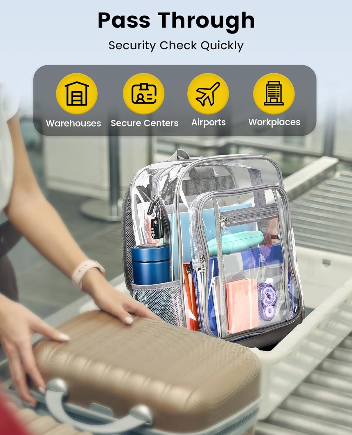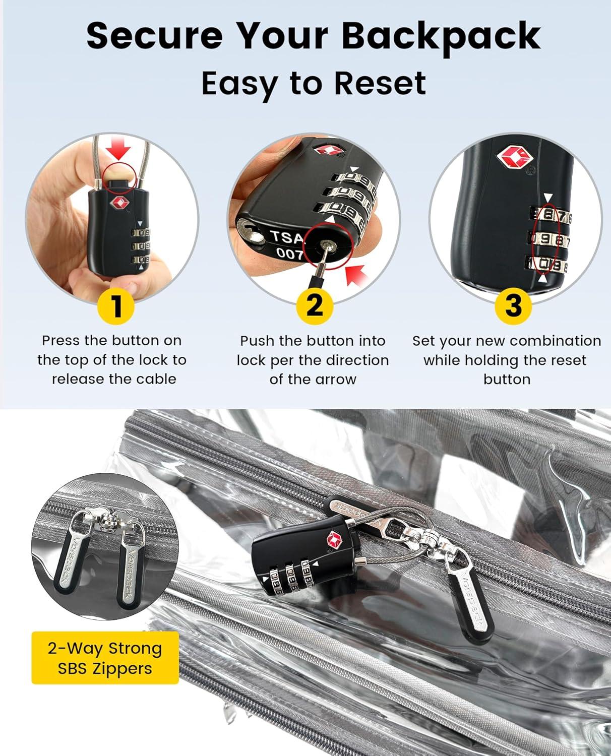 It has a TSA lock: This transparent backpack is equipped with SBS smooth zippers. The main compartment features 2 way heavy-duty zippers, providing easy access. And the clear school backpack comes with a TSA-approved lock, which enhances the security of your belongings, ensuring that your items remain safe and protected during travel