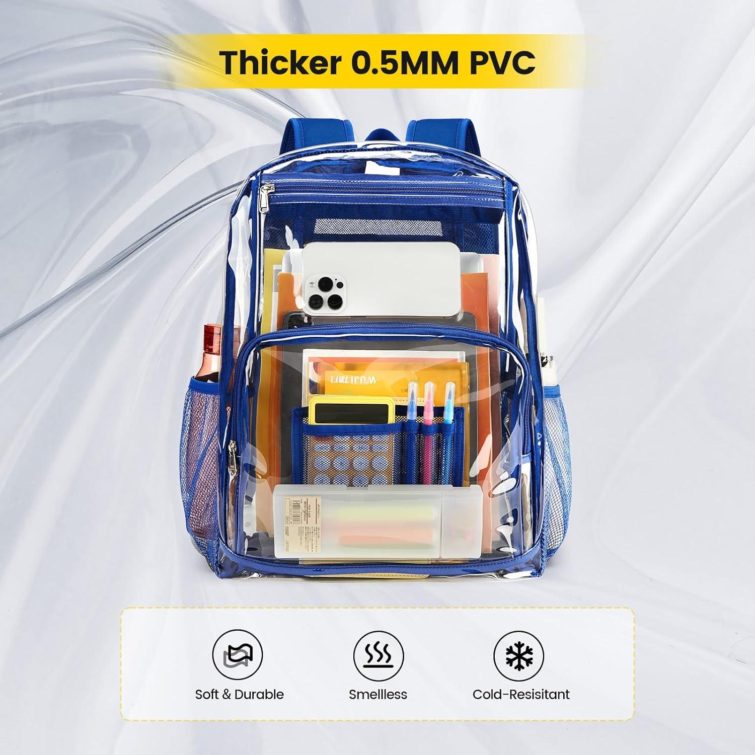 Thicker PVC material: Vorspack clear backpacks are made from thick, odorless PVC material, ensuring durability for daily use. The clear bookbags can be easily cleaned by wiping them down with a towel. Besides, the transparent backpack is heavy-duty and flexible, allowing you to fold them without cracking