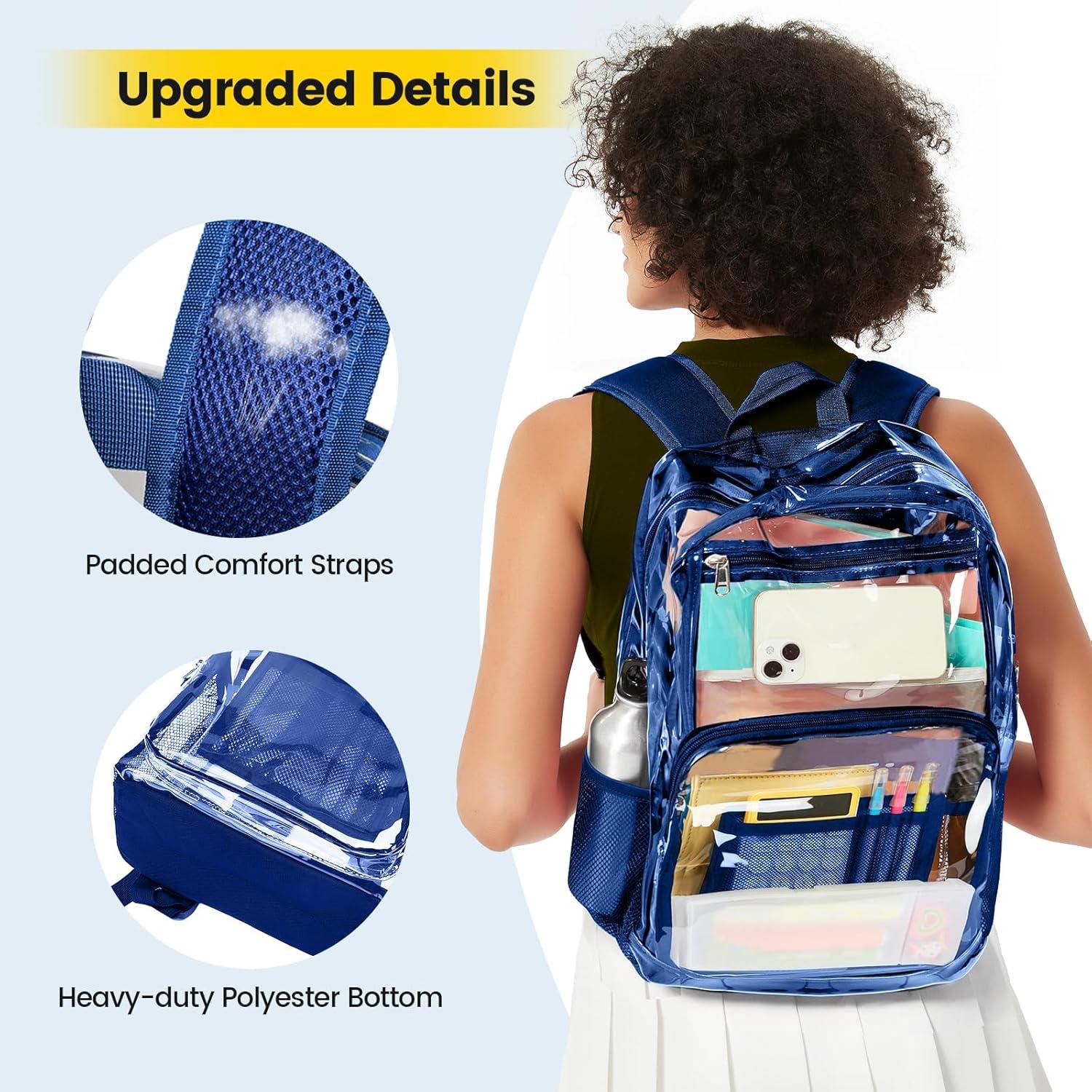 Comfort padded straps: Our see through backpack is designed with reinforced strap stitches for secure attachment. The adjustable shoulder straps are padded and wider than average, reducing stress and providing added comfort. And, the polyester bottom of the transparent bag is heavy-duty