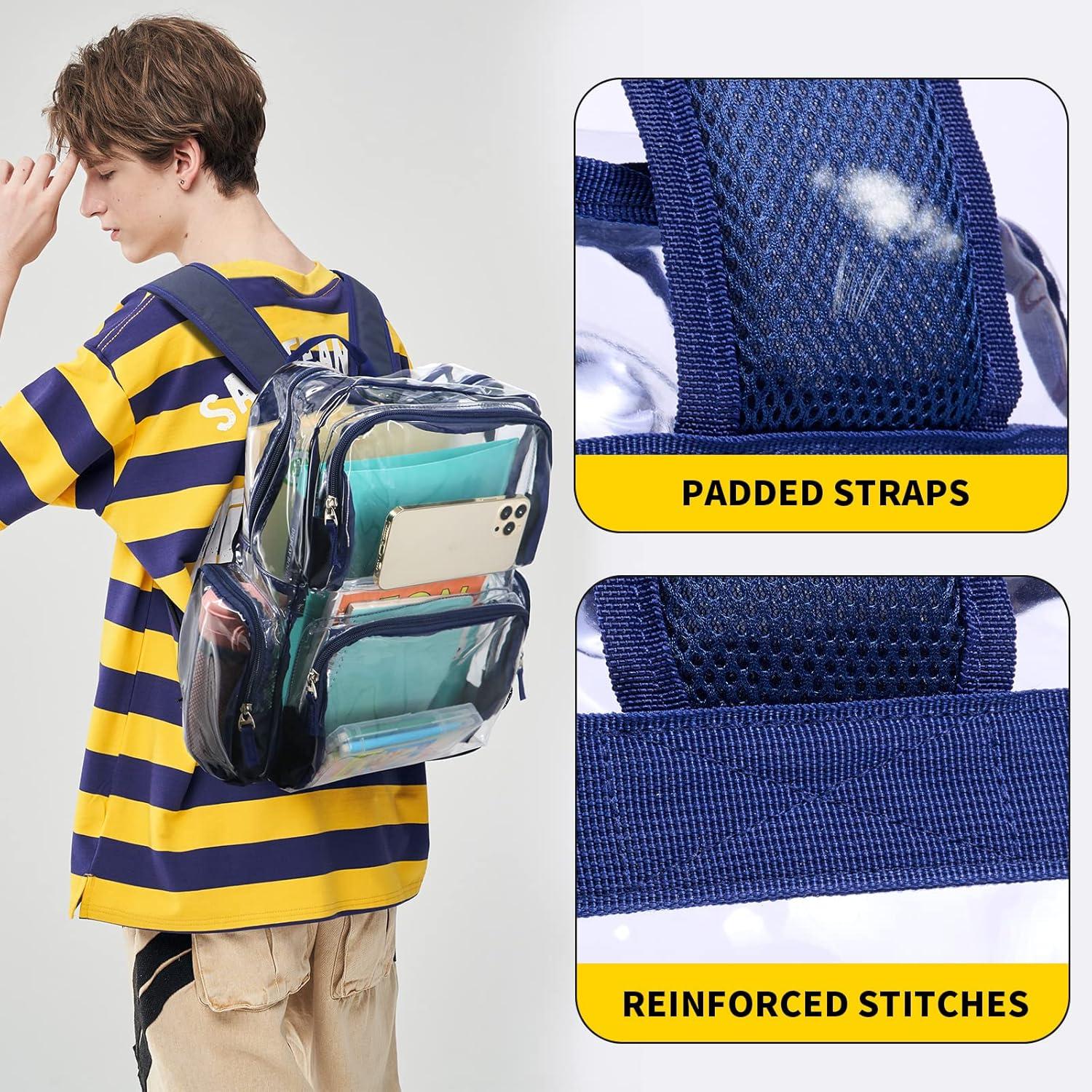 Reinforced fabric bottom & padded straps: In order to make the see through backpack more heavy duty and sturdy, we upgraded the bottom with thick polyester and strengthened stitches. To ease the stress on your shoulders, each strap is designed wider than usual and padded for comfort