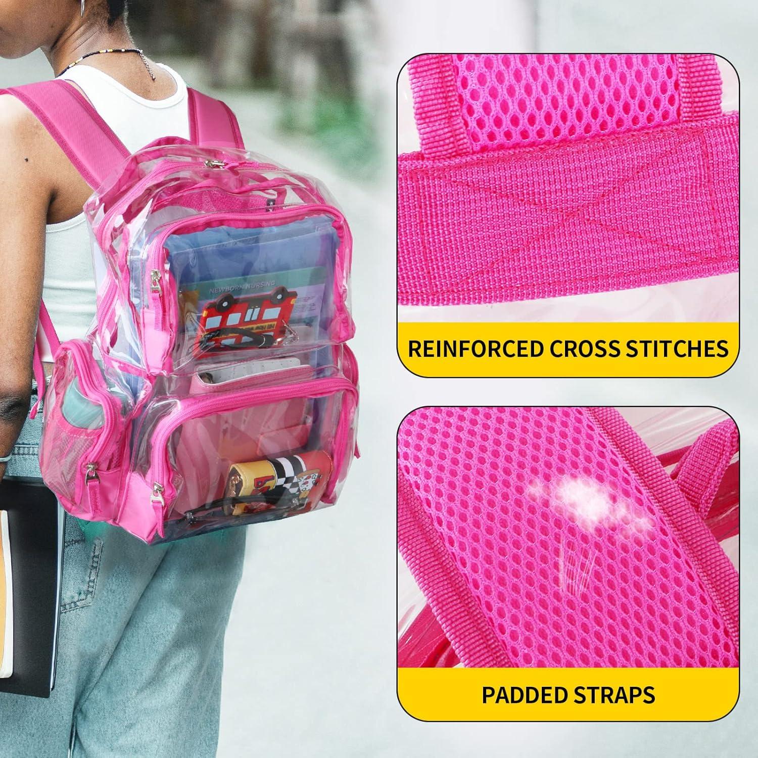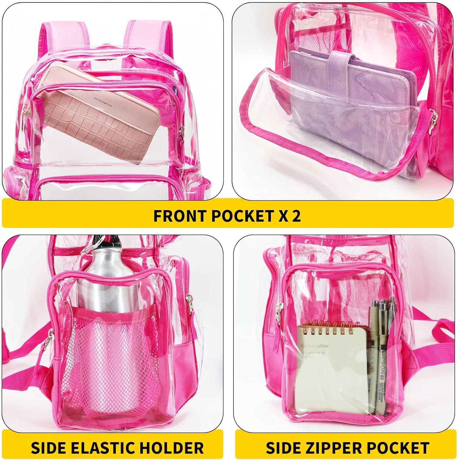 Reinforced fabric bottom & padded straps: In order to make the see through backpack more heavy duty and sturdy, we upgraded the bottom with thick polyester and strengthened stitches. To ease the stress on your shoulders, each strap is designed wider than usual and padded for comfort