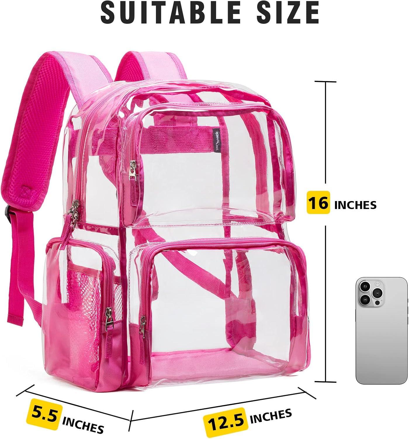 Vorspack clear backpack heavy duty. Do you need a quality heavy-duty backpack for everyday use? Take it easy. we'll get the job done! Our transparent backpack is perfect for work, college, travel, concert, and sports. Size: 16 x 12.5 x 5.5 inches (H x L x W). Multi-functional Compartments. 1 large main compartment: It can stores binders, laptops, books, folders, gym clothes, shoes, and more. 2 front compartments: It's large enough for personal items such as notepads, glasses, lunch containers, etc., 2 side mesh pouches: Great for water bottles or folding umbrellas. Thicker PVC Material. Made of thicker smell-less PVC, this clear backpack for adults is heavy-duty and sturdy for a long time daily use, and it's soft that you can fold it as you need. Also, it would not crack even in cold weather. Easy to clean. Thickened Padded Straps. Reinforced Stitching. Wide-open Design. Suitable for gym, sports, travel, college, daily use, concert, airport, workplace. Note: not stadium approved. Perfect chioce for her or him on Birthday, Christmas, Halloween, Carnival.