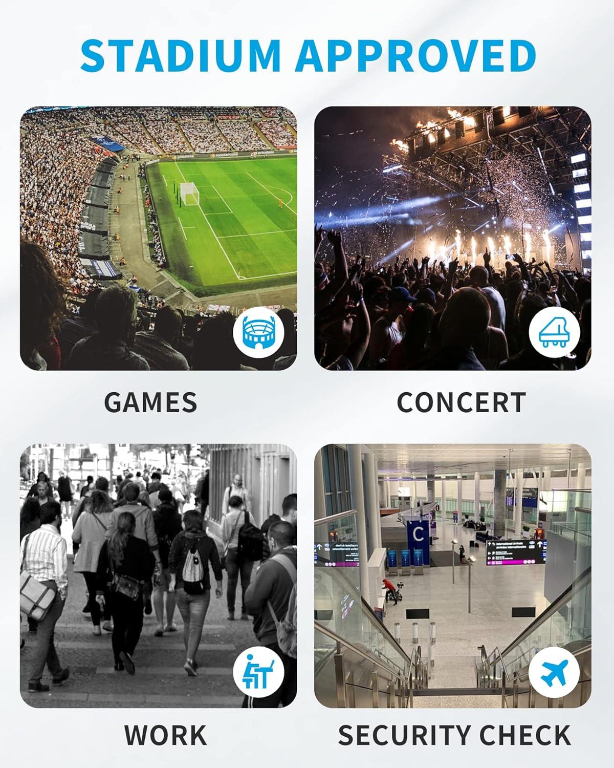 Multi-purposes for all situations: the 12x12x6 stadium approved transparent backpack can quickly get you ready to go by saving your time for packing and checking. Wear it to sports events, concerts, music festivals, workplaces, beach, warehouse etc., you can make the security check a breeze.