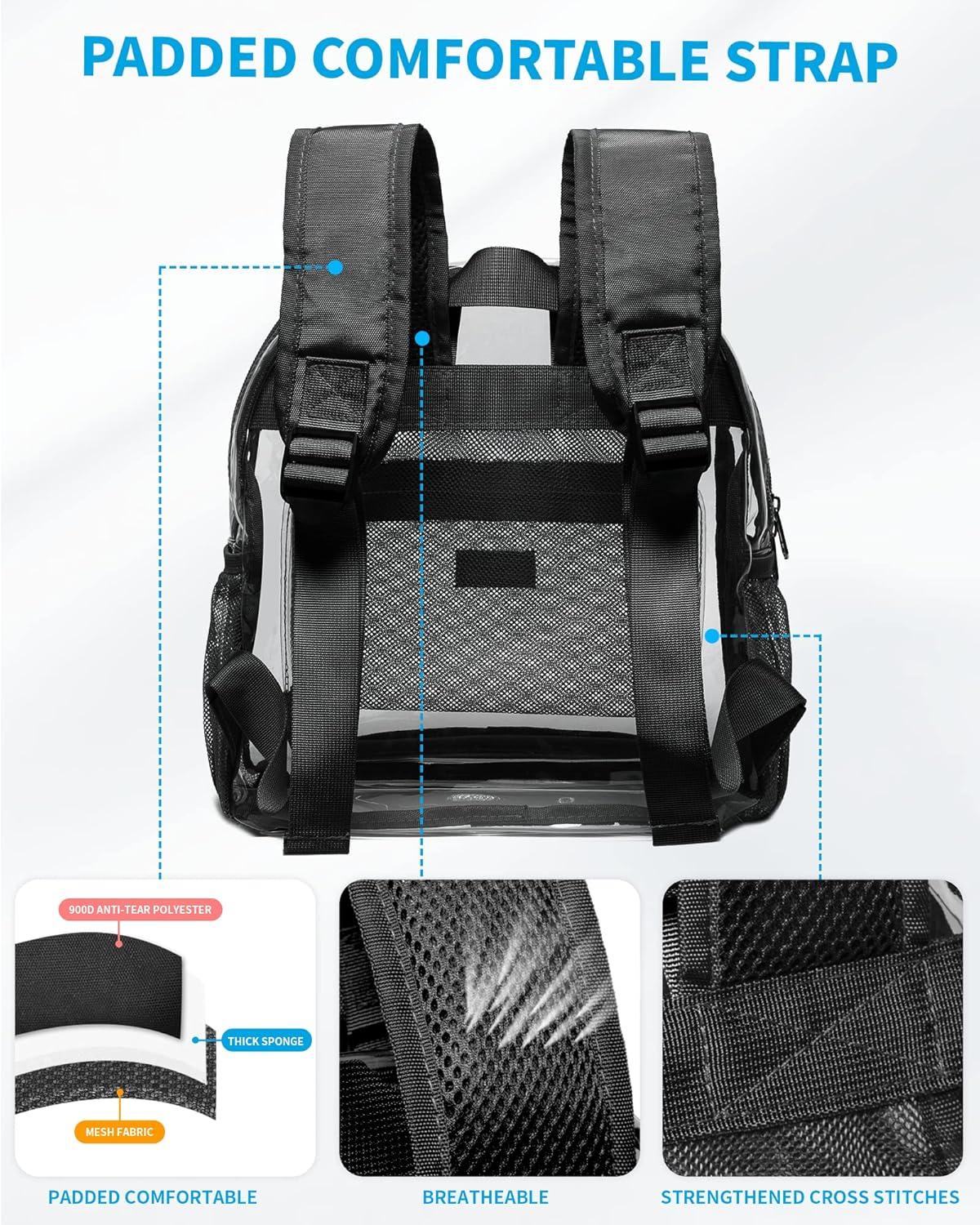 Heavy duty clear stadium backpack: made of upgraded 0.5mm thick smellless PVC material, the stadium approved backpack is both durable and soft, sturdy enough for everyday use, and it would not crack even in cold weather.