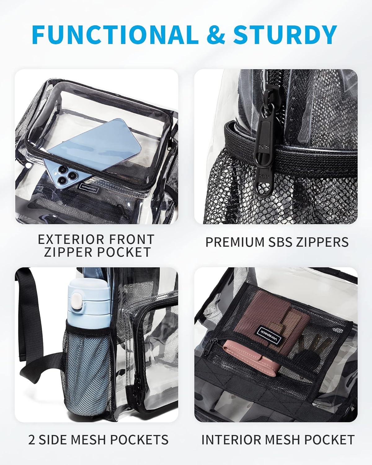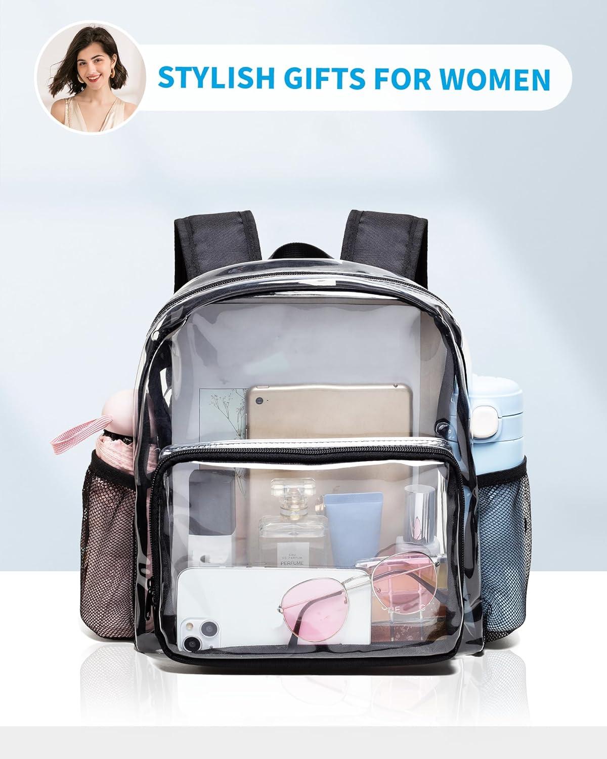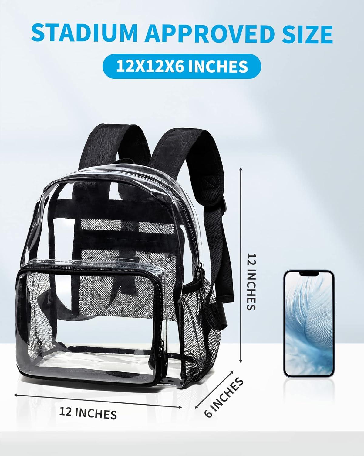 Clear backpack stadium approved: the mini clear backpack measures 12x12x6 inches, and completely transparent all around, great for where requires stadium approved clear bags such as concert, festival, sport event, football games, etc.