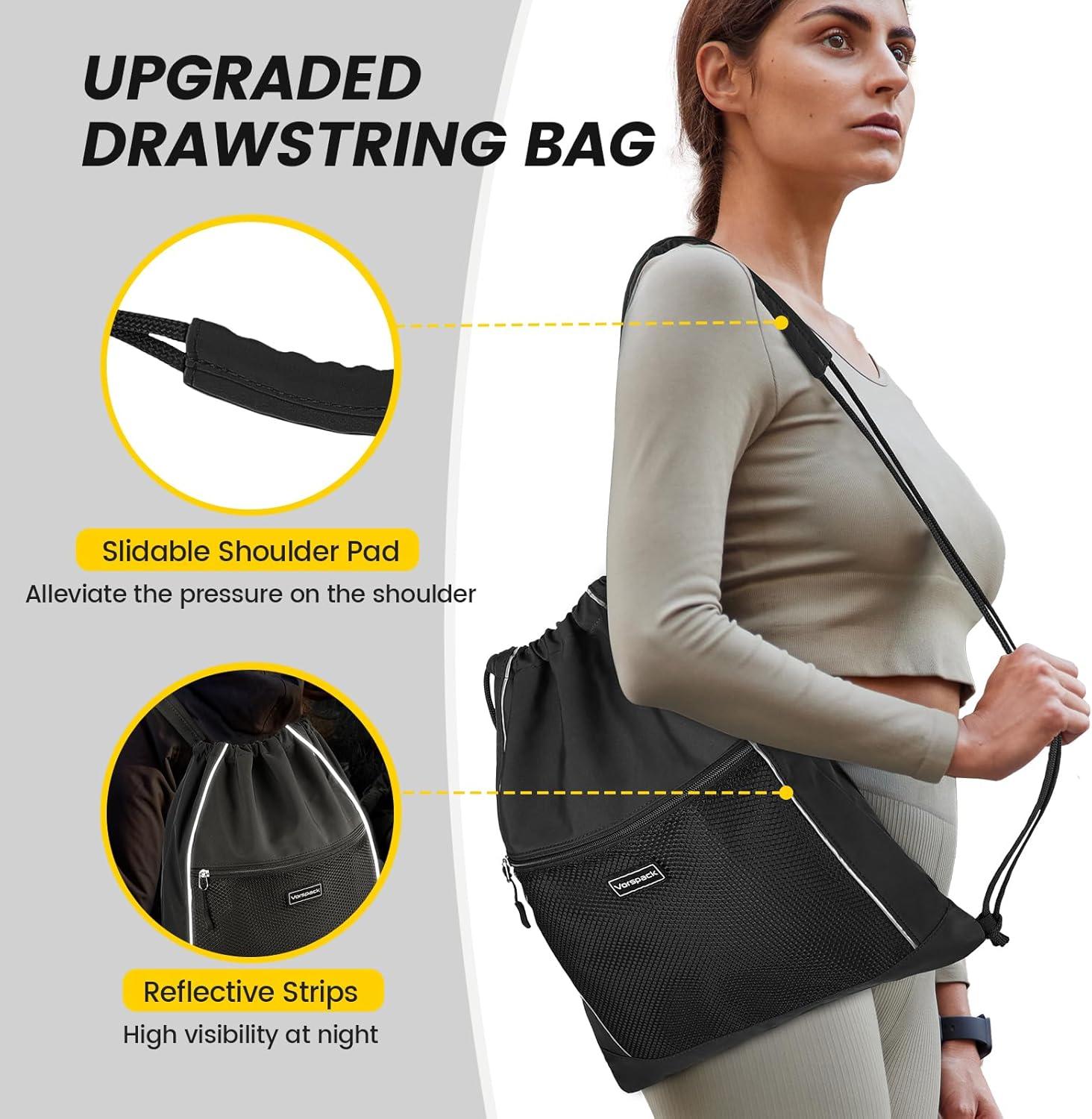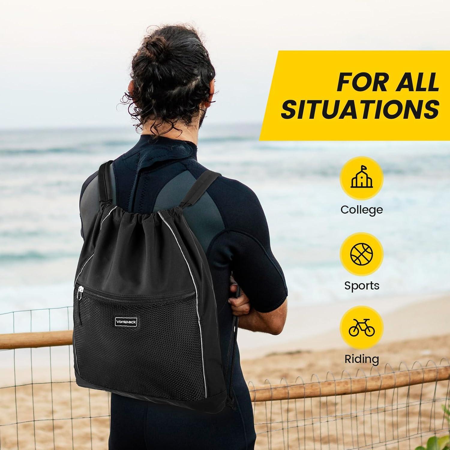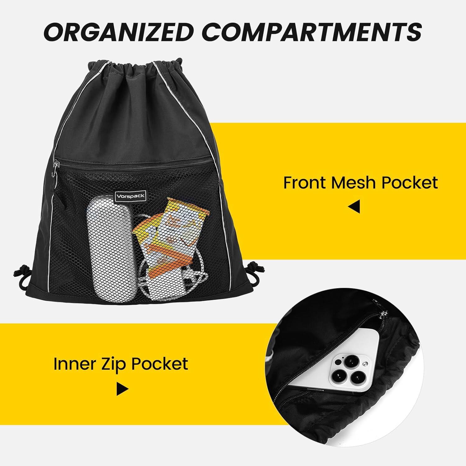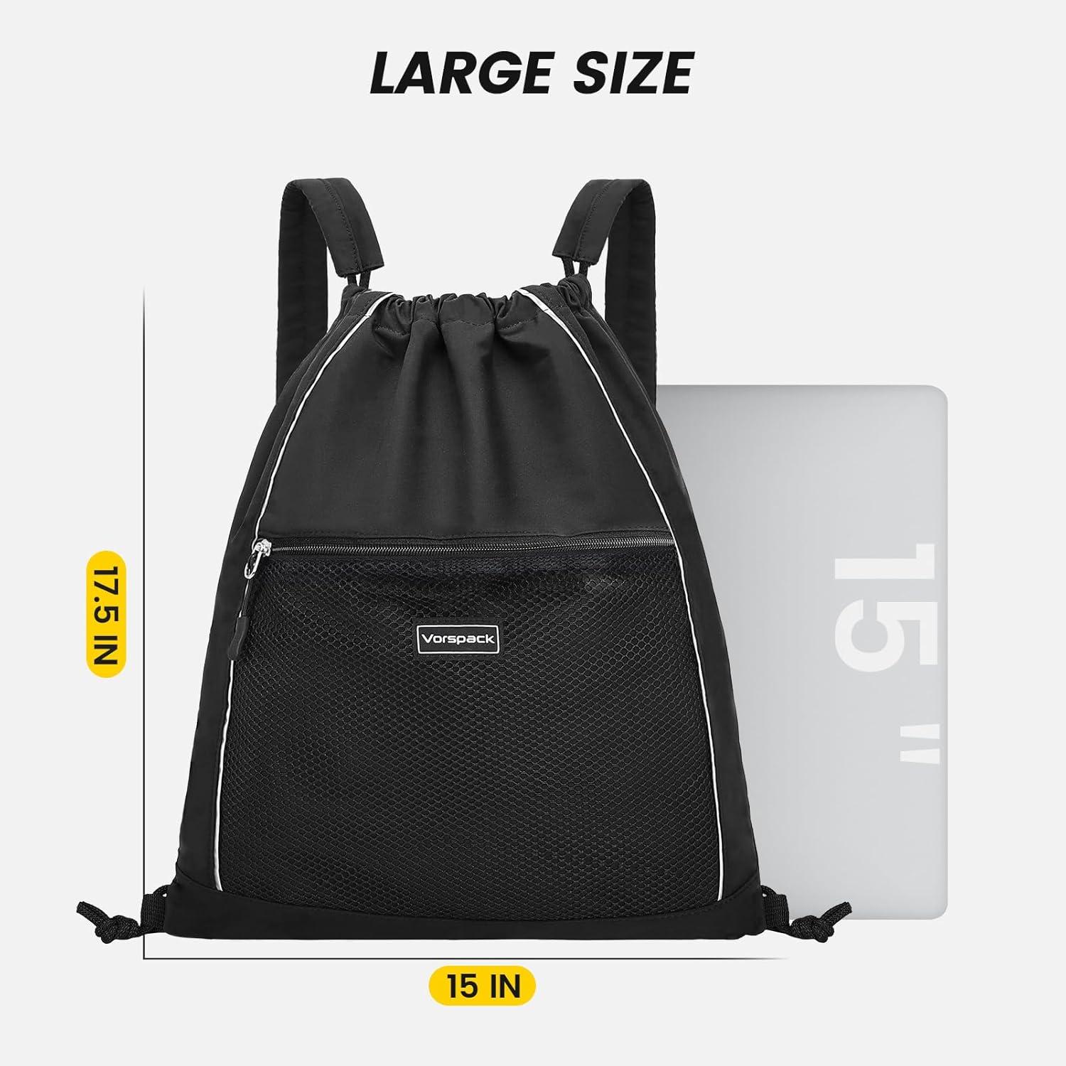 Vorspack Drawstring Backpack – Drawstring Bag with Mesh Pocket String Backpack with Reflective Strips Sackpack Cinch Bag for Sport Gym Travel – Black