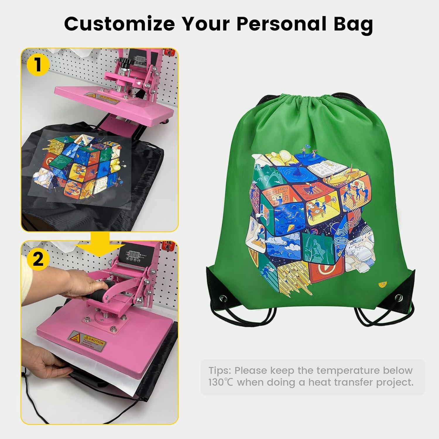 DIY friendly: Vorspack cinch bags are suitable for any DIY project. You can use HTV with a heat press on these bags to customize them for each one. Add some decorations like Numbers/ Names/ logos/ Pictures on them, it will be eye-catching.TIPS: Put a pressing pillow or towel on the inside and cover with a Teflon sheet will make it easier. Mind the temperature, if the fabric starts to shrivel, your press is too hot