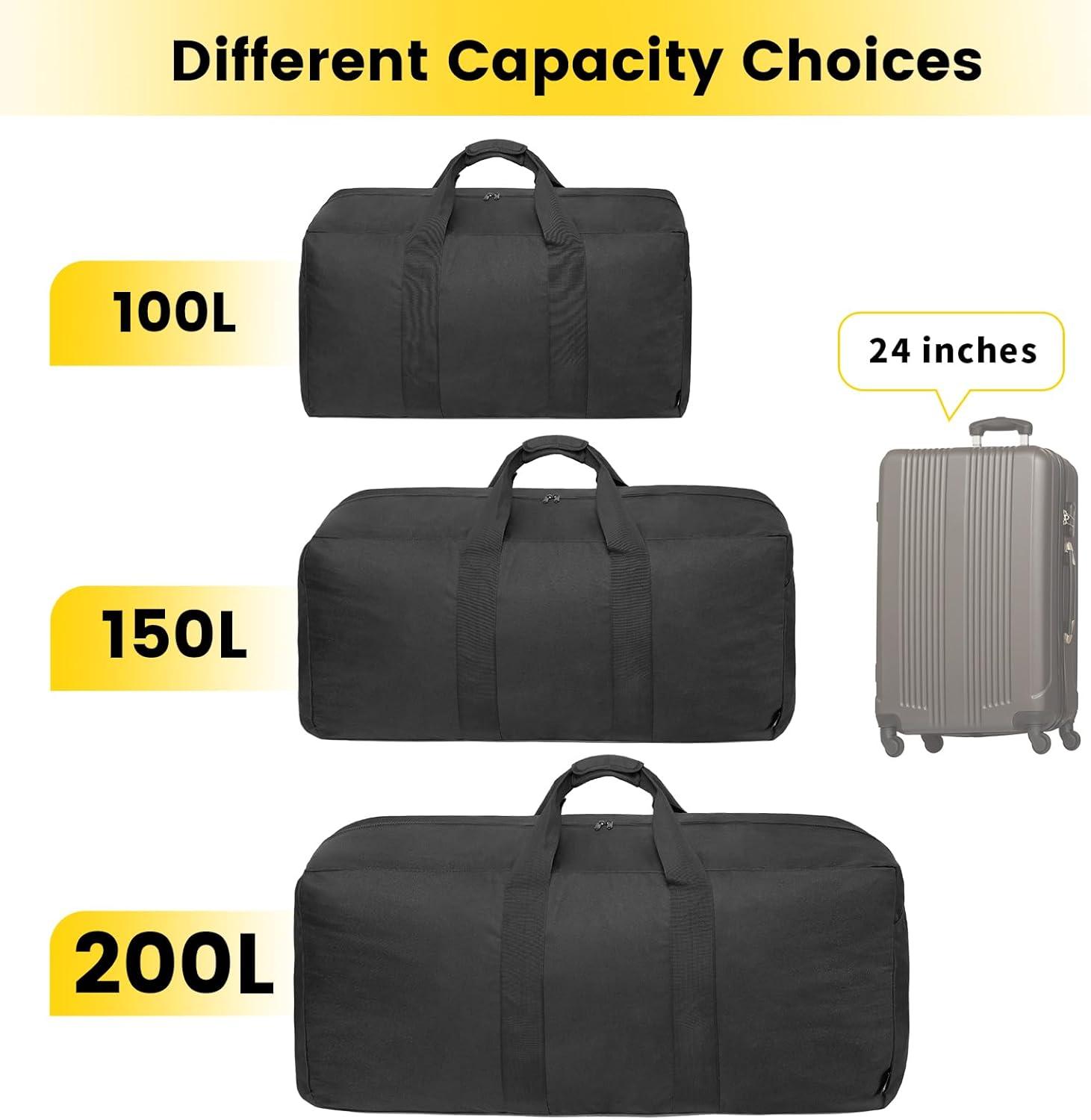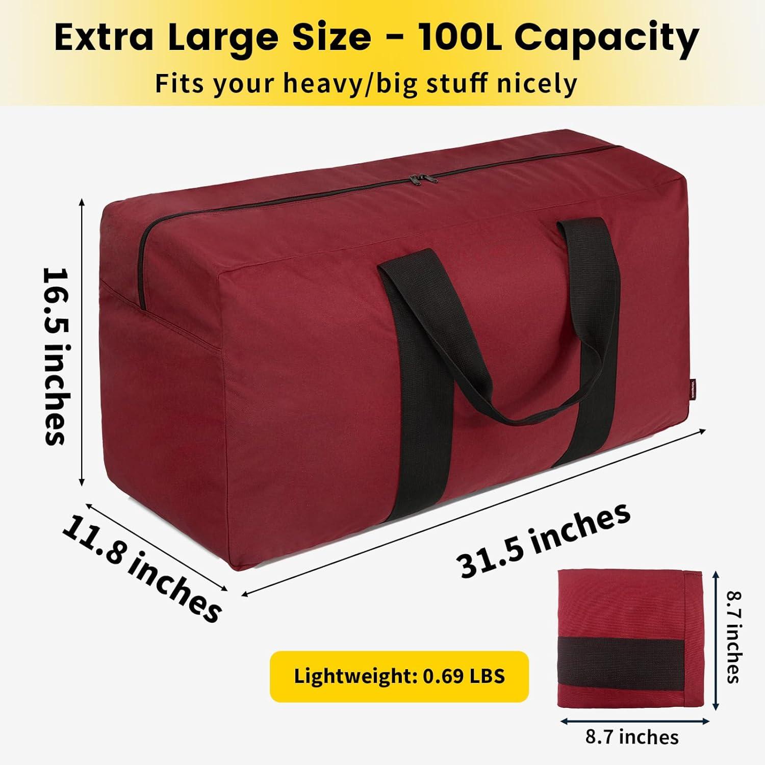 Extra-large capacity: Unfolded Size: 31.5×16.5×11.8 inches, the duffle bag is 100L capacity, it is large enough to store all your gear and accessories for long trips and traveling. And it can fits your larger and heavier items nicely