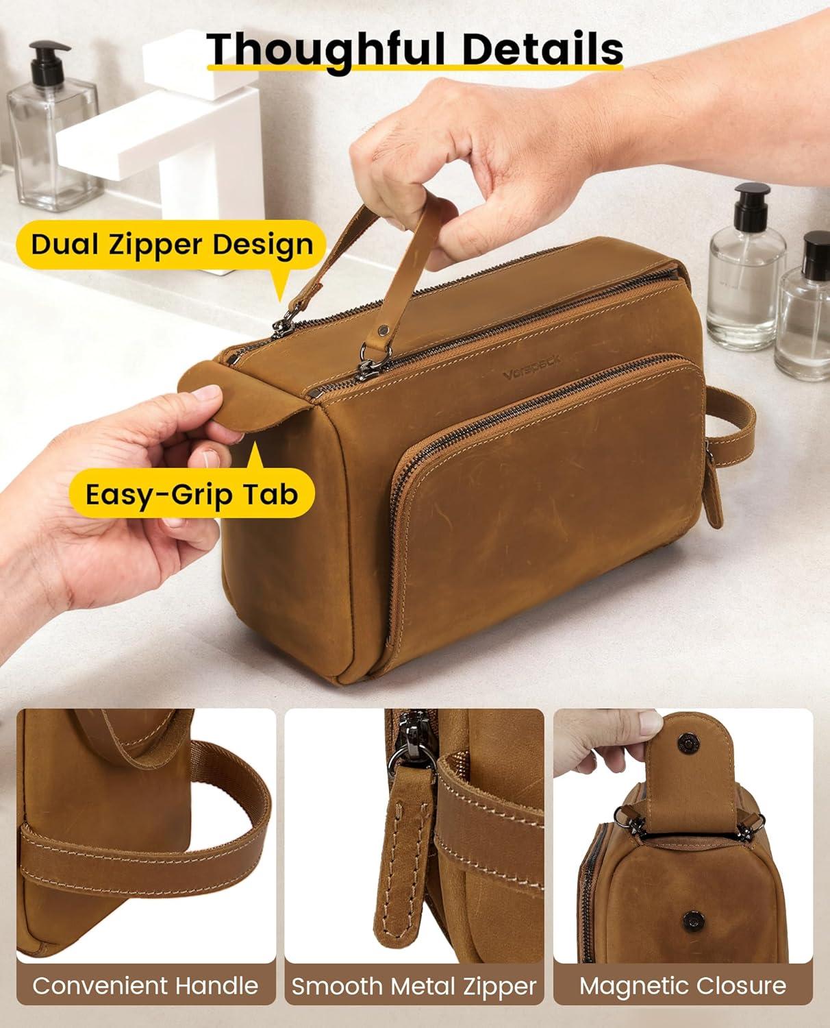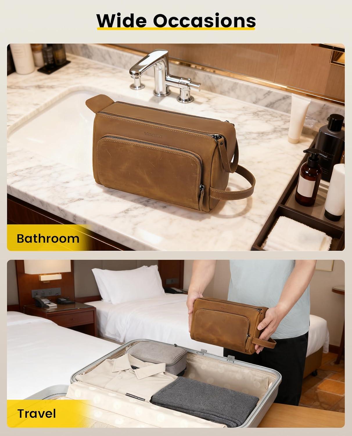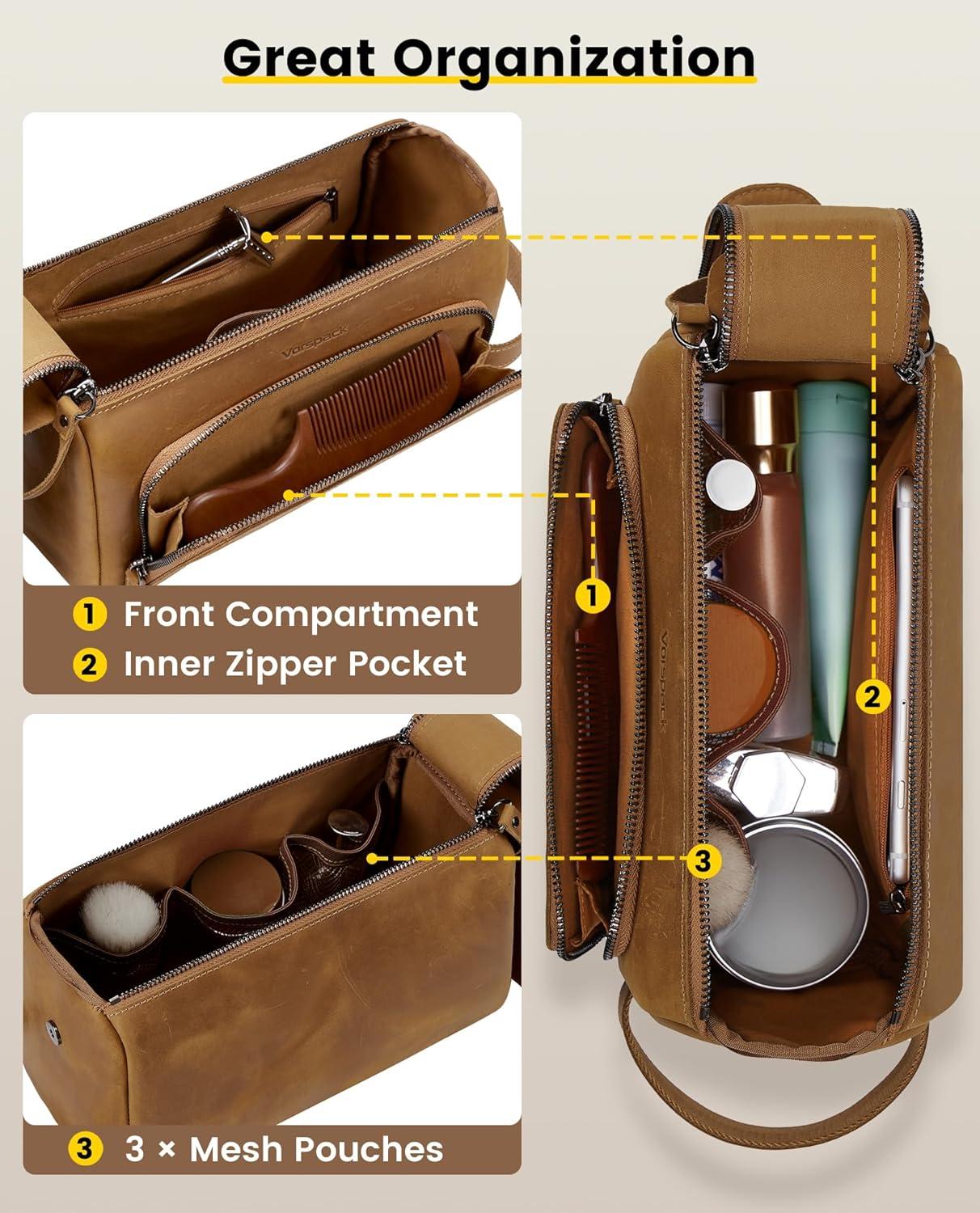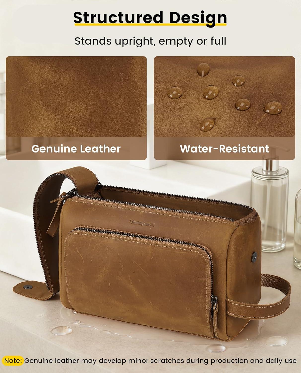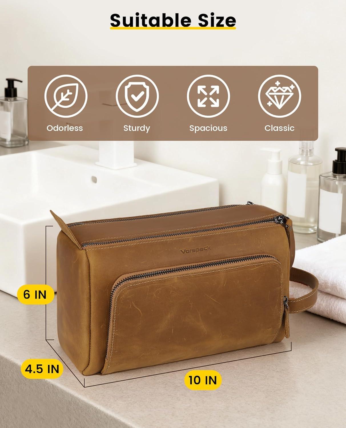 Vorspack Genuine Leather Toiletry Bag for Men – Water Resistant Travel Bag for Toiletries, Essentials, Accessories – Dark Brown(Light Brown)