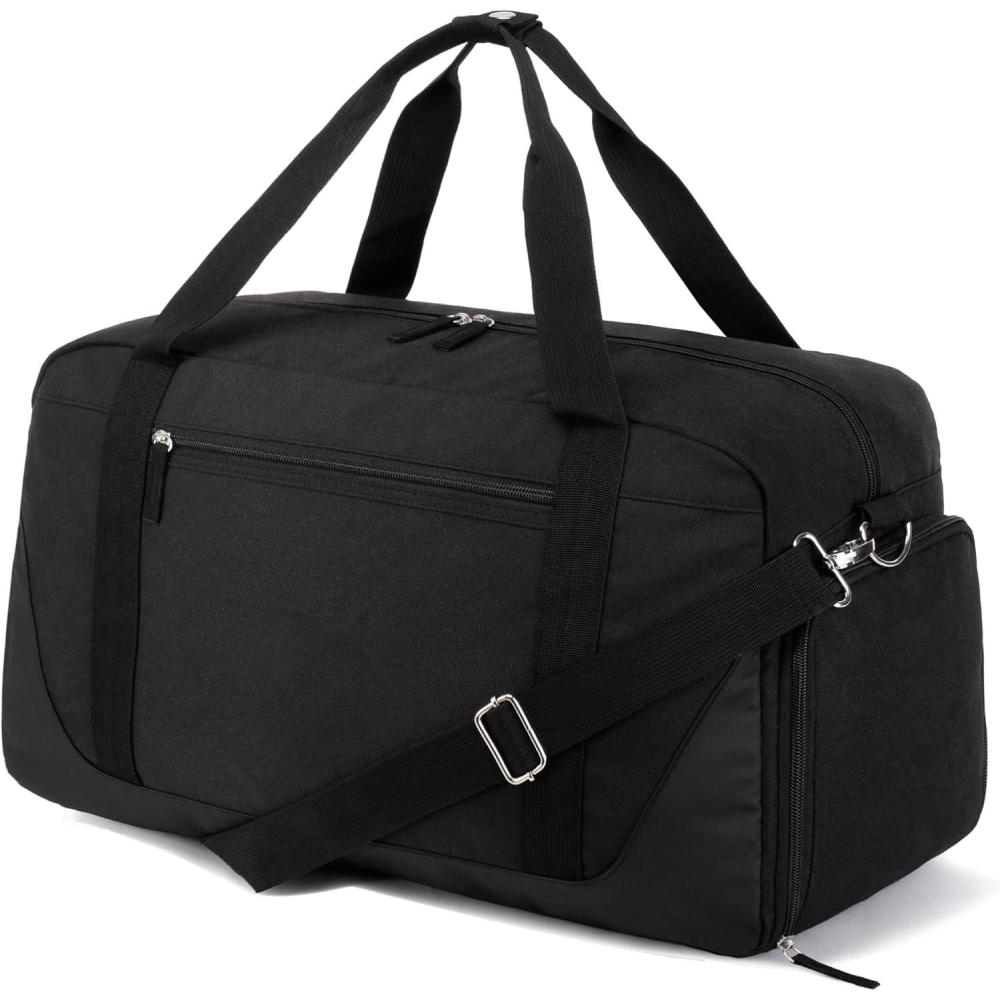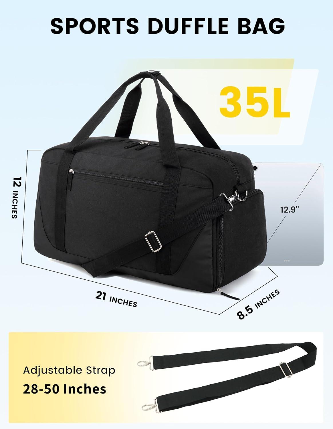 Roomy & organized sports duffle bag: Measures 21 x 12 x 8.5 inches, the capacity of this Gym bag for women is about 35. The carry on duffel bag is roomy enough and has 8 pockets to organize your clothes, daily necessities, toiletries, or some small Gym items well. Totally meet your needs for sports, gym, or weekend trips