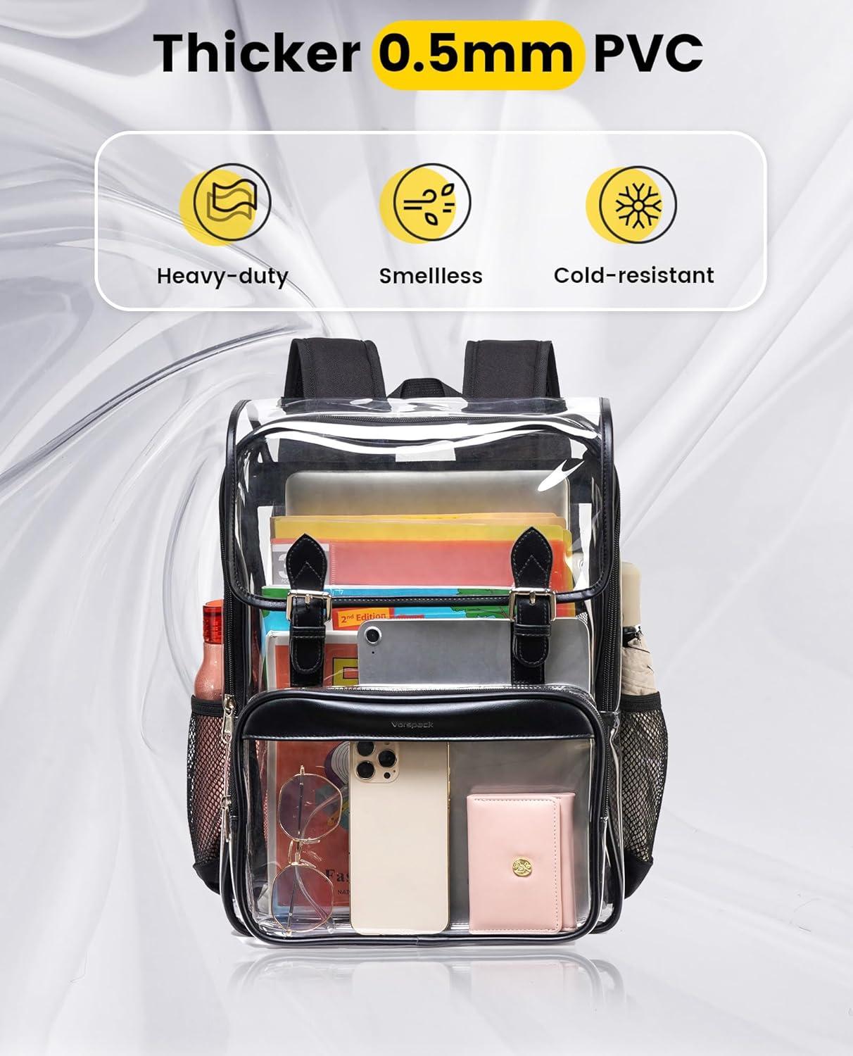 Vorspack Heavy Duty Clear Backpack – Large See Through Bookbag Transparent Backpacks for College, Work, Travel – Black(Black)