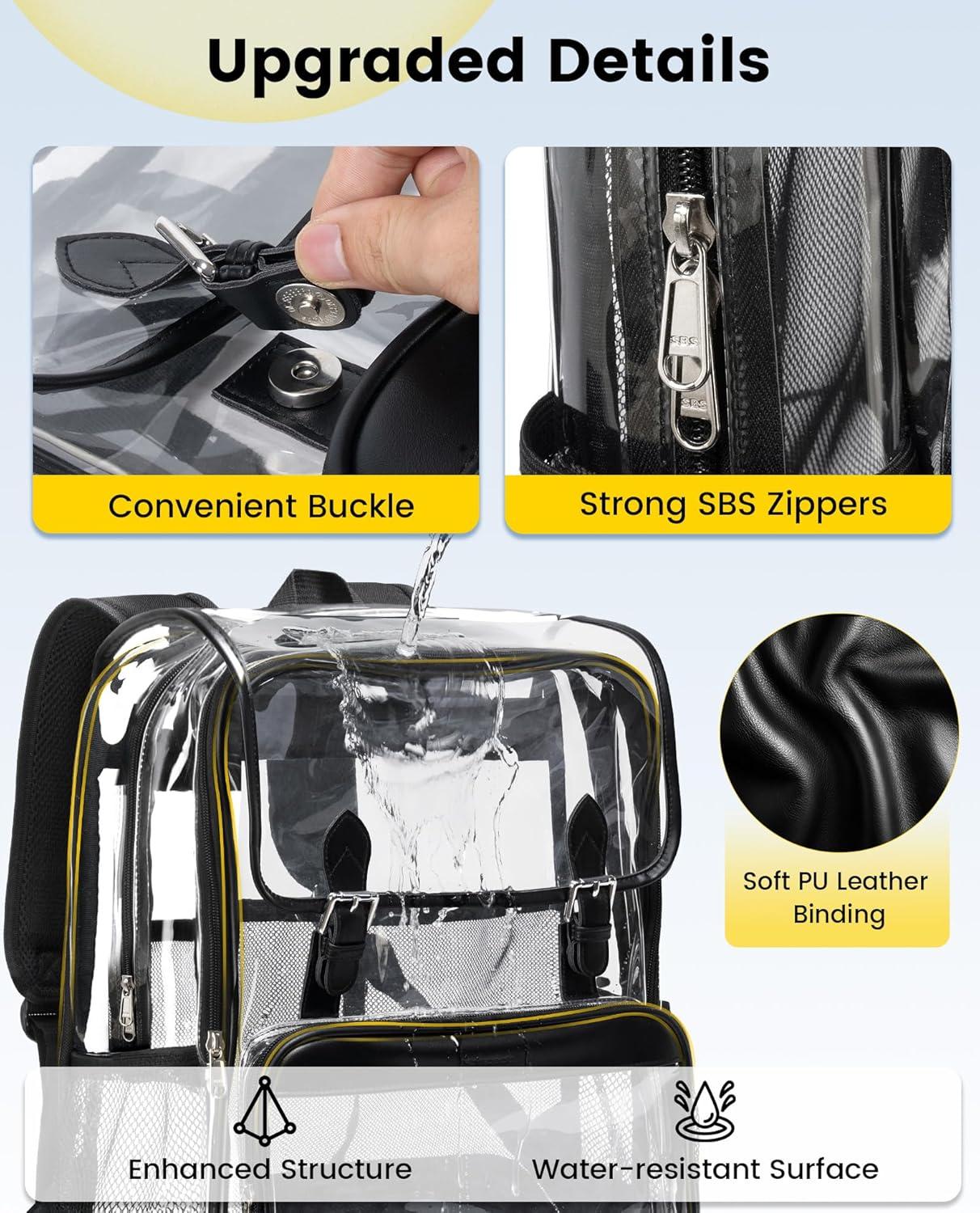 Structural design: The transparent backpack is made from heavy-duty 0.5mm thick PVC material, which is water-resistant and sturdy. Its plastic frame-strip design keeps its shape, while the soft PU leather trim adds a texture. The see-through backpack makes security checks quick and lets you easily spot your belongings