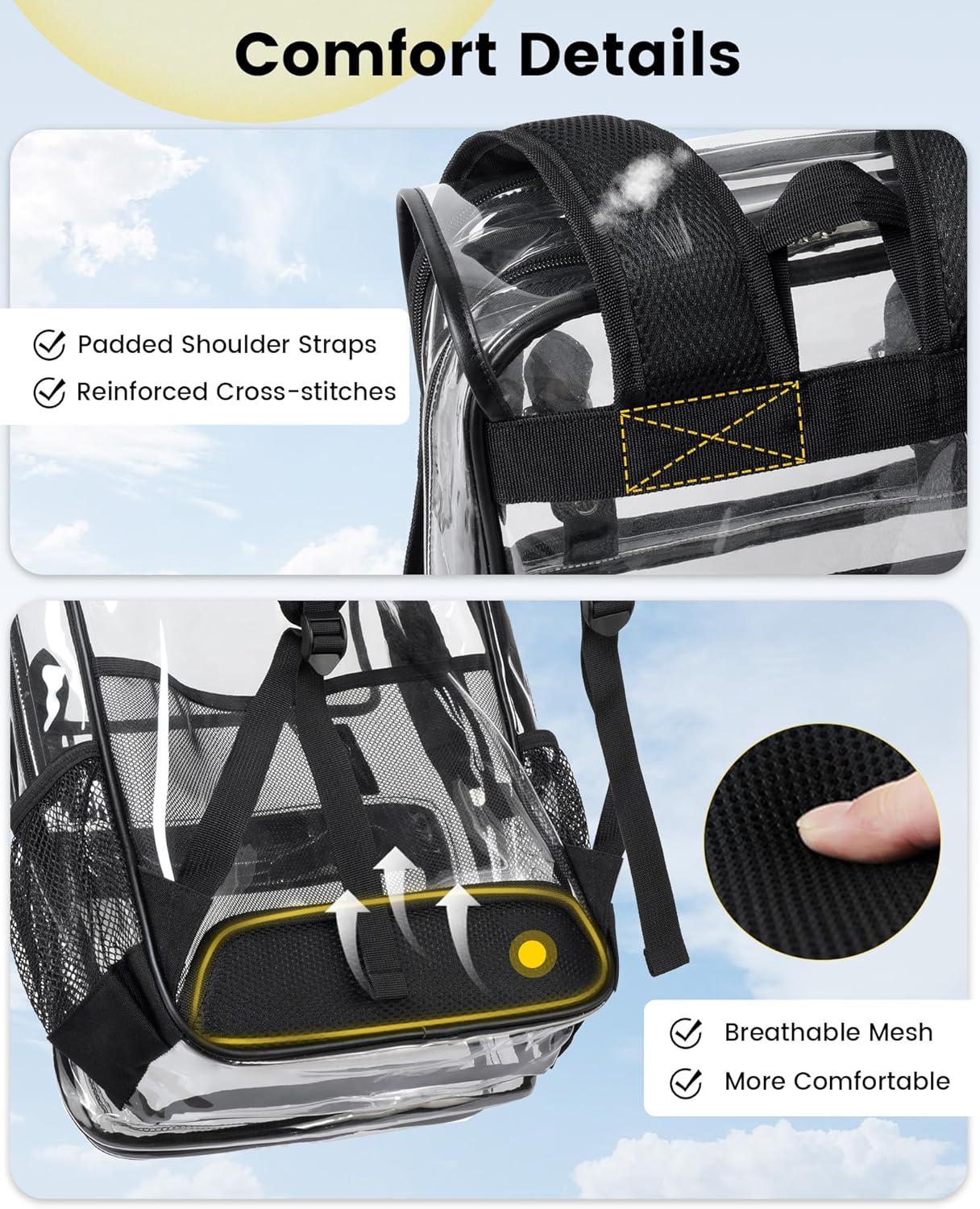 Comfort straps: Designed with wide, breathable, padded shoulder straps, this large clear backpack for girls and boys reduces pressure when carrying heavy school supplies. The reinforced 4-layer back bottom of the heavy duty clear backpack helps reduce waist pressure for added comfort