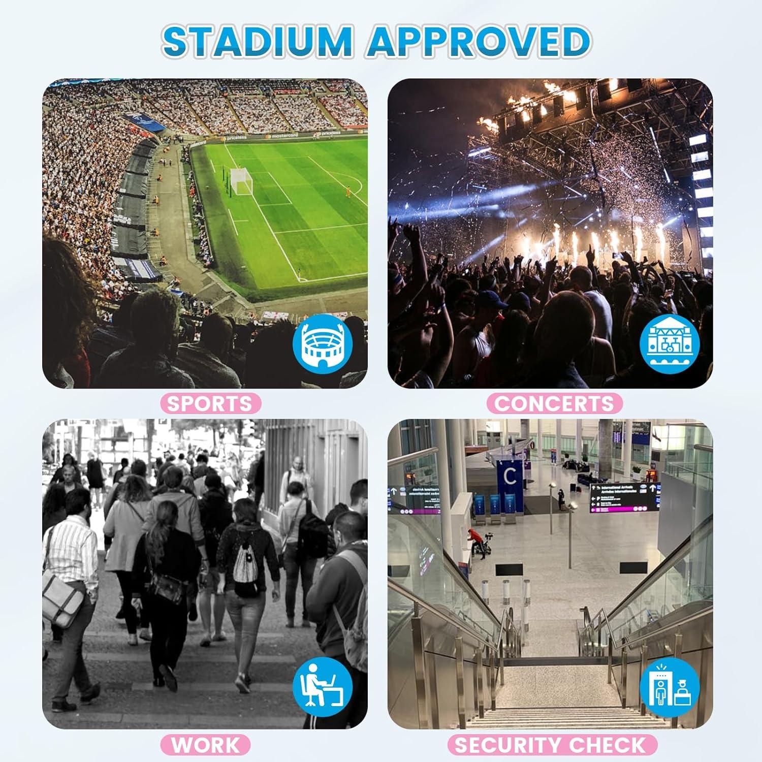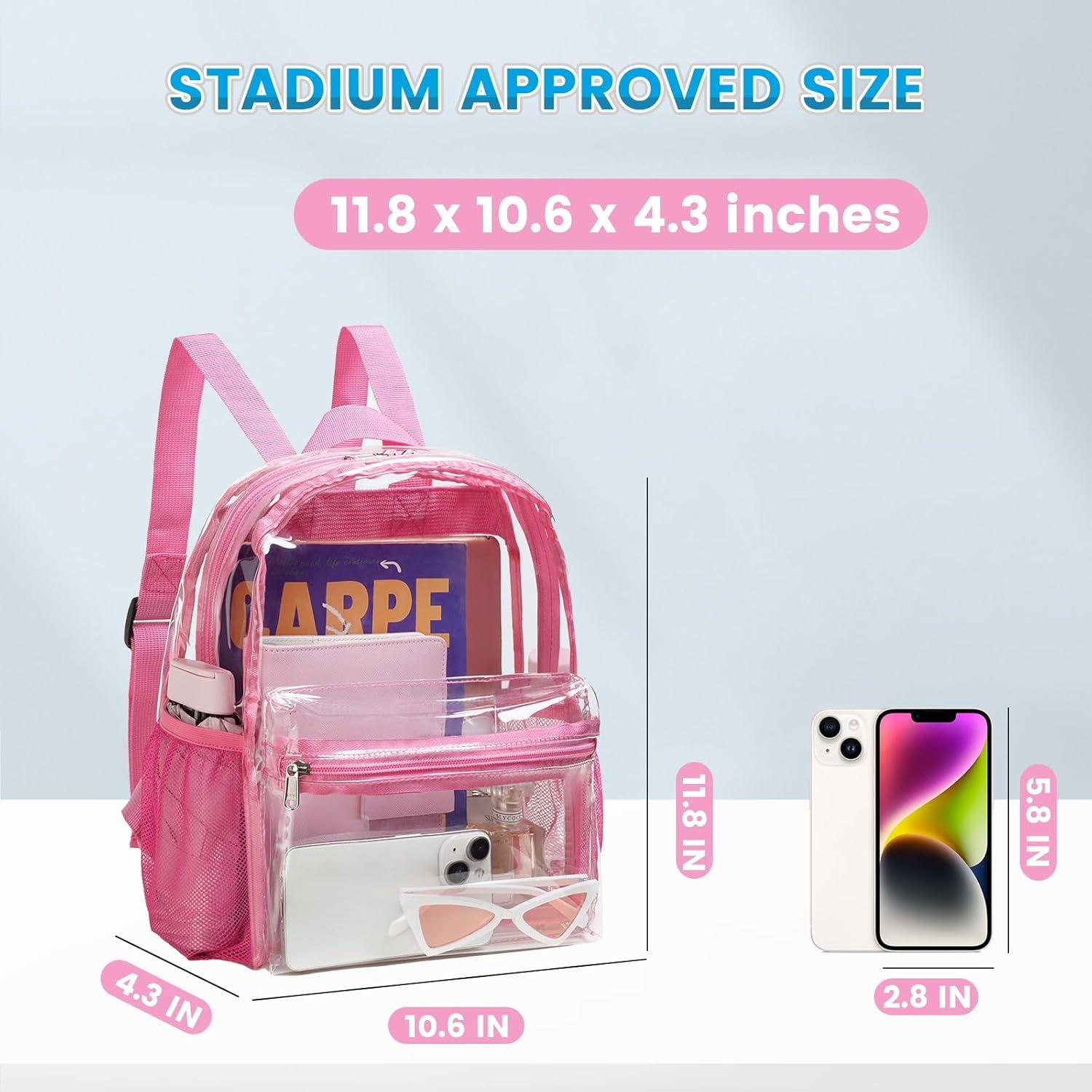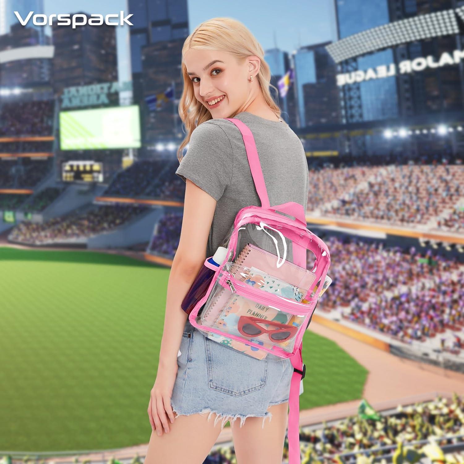 Clear backpack stadium approved: Size 11.8 x 10.6 x 4.3 inches, Vorspack clear mini backpack meets clear stadium bag requirement of no bigger than 12x6x12 inches. By owning a transparent backpack, you can easily pass through security lines without wasting time