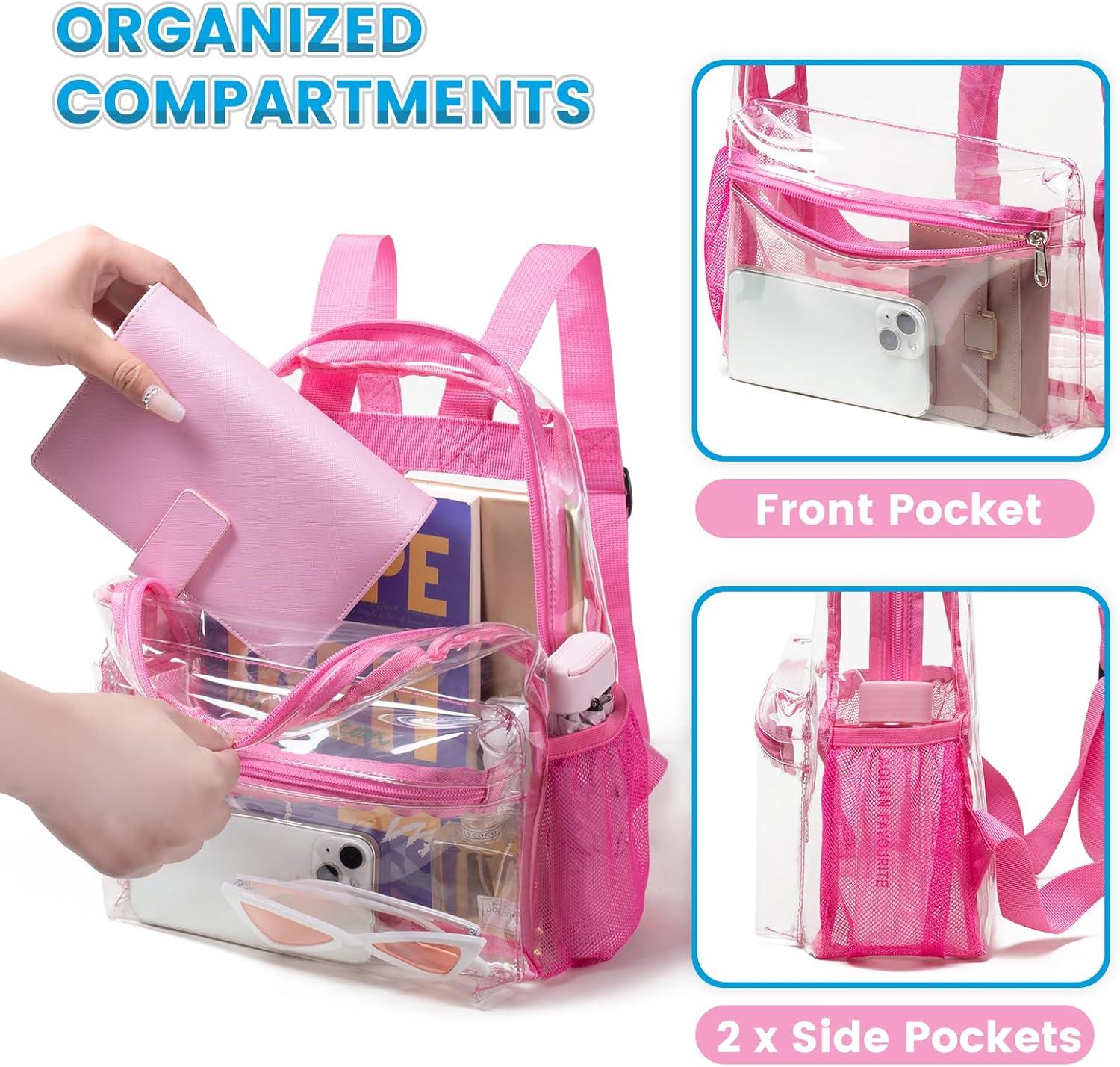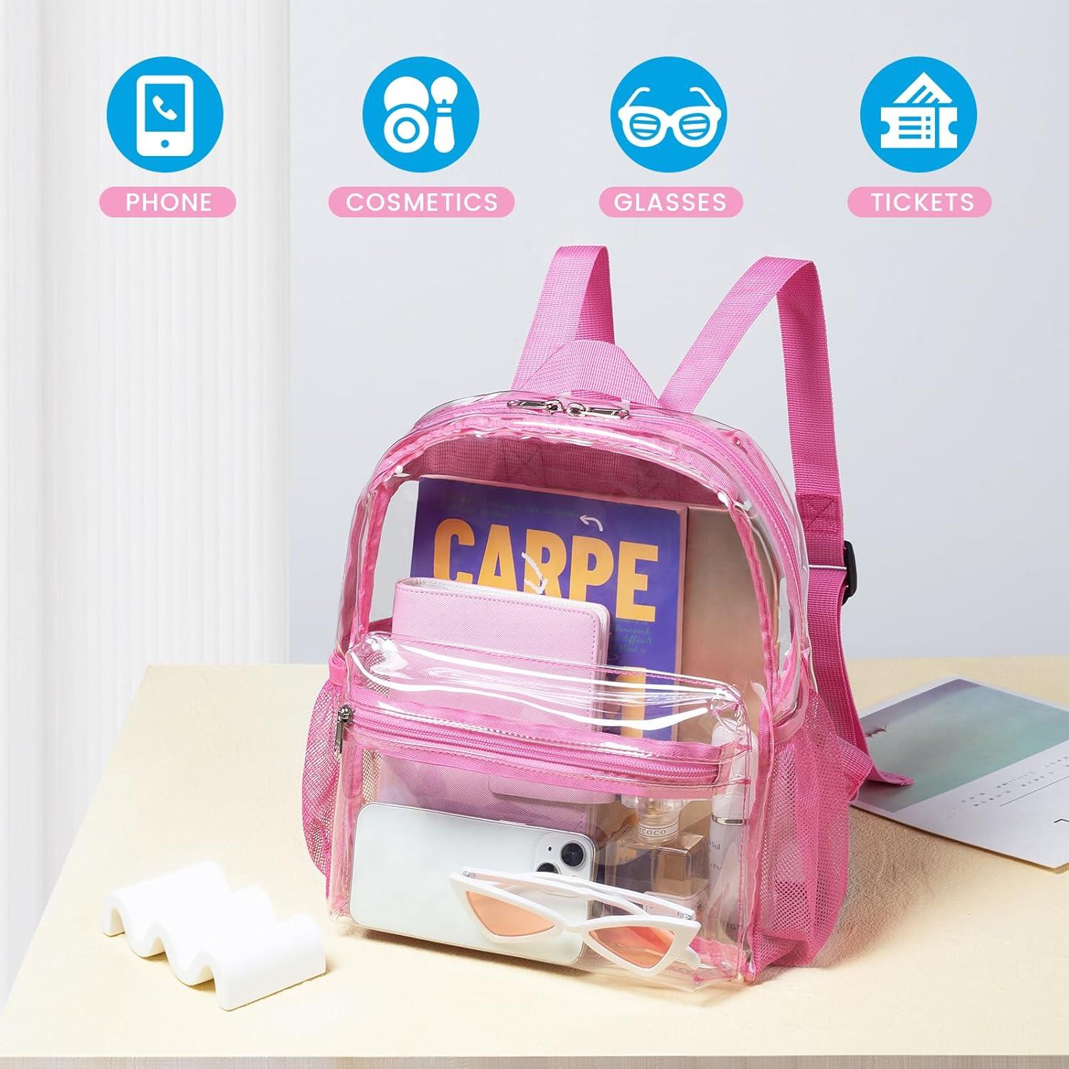 Functional see through backpack: The small clear backpack with 1 main double SBS zipper compartment that is roomy enough to hold your 11'' Pad Pro, and large items; 1 front zipper pocket for small items; 2 side mesh pockets for water bottles or folding umbrellas