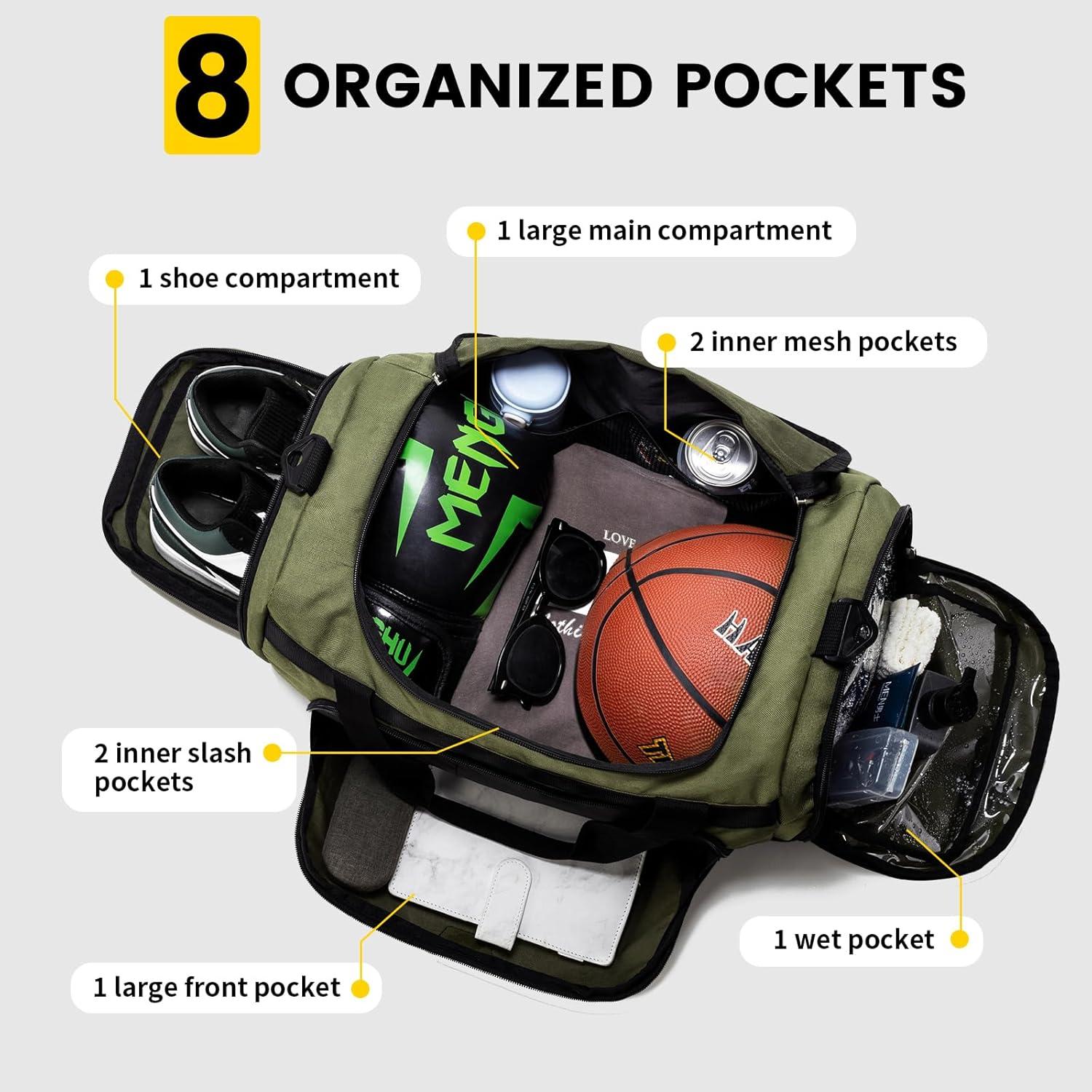 Roomy & organized gym bag: Sizes 19.5 x 10.5 x 12 inches, and weighs 1.2lb / 550g, the capacity of this gym bags for men is about 40L. The duffle bag for travel has 8 pockets to organize well your clothes, daily necessities, toiletries, or some small gym items to meet your needs for sports, gym, or weekend trips