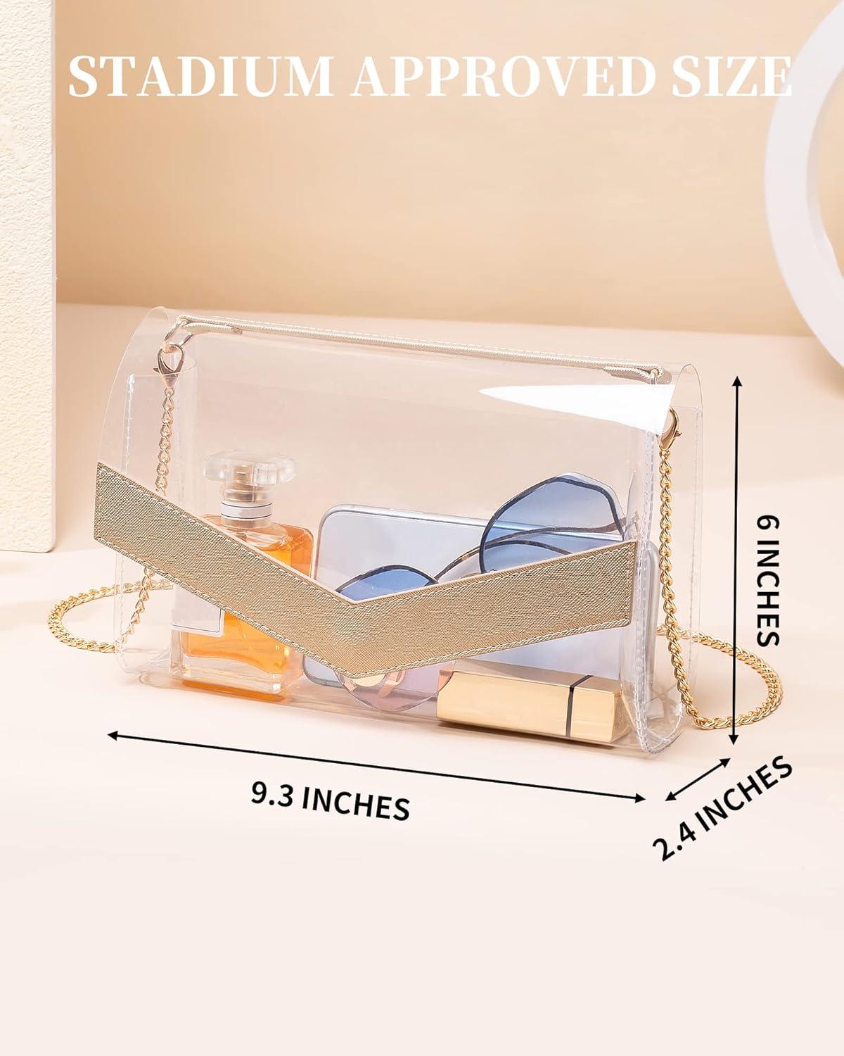 Stadium approved: The clear stadium bag measures 9.3 x 6 x 2.4 inches, which is totally meets the stadium tournament bag policy. The internal capacity can easily hold your daily storage needs such as phone, wallet, sunglasses, keys and a few makeup accessories